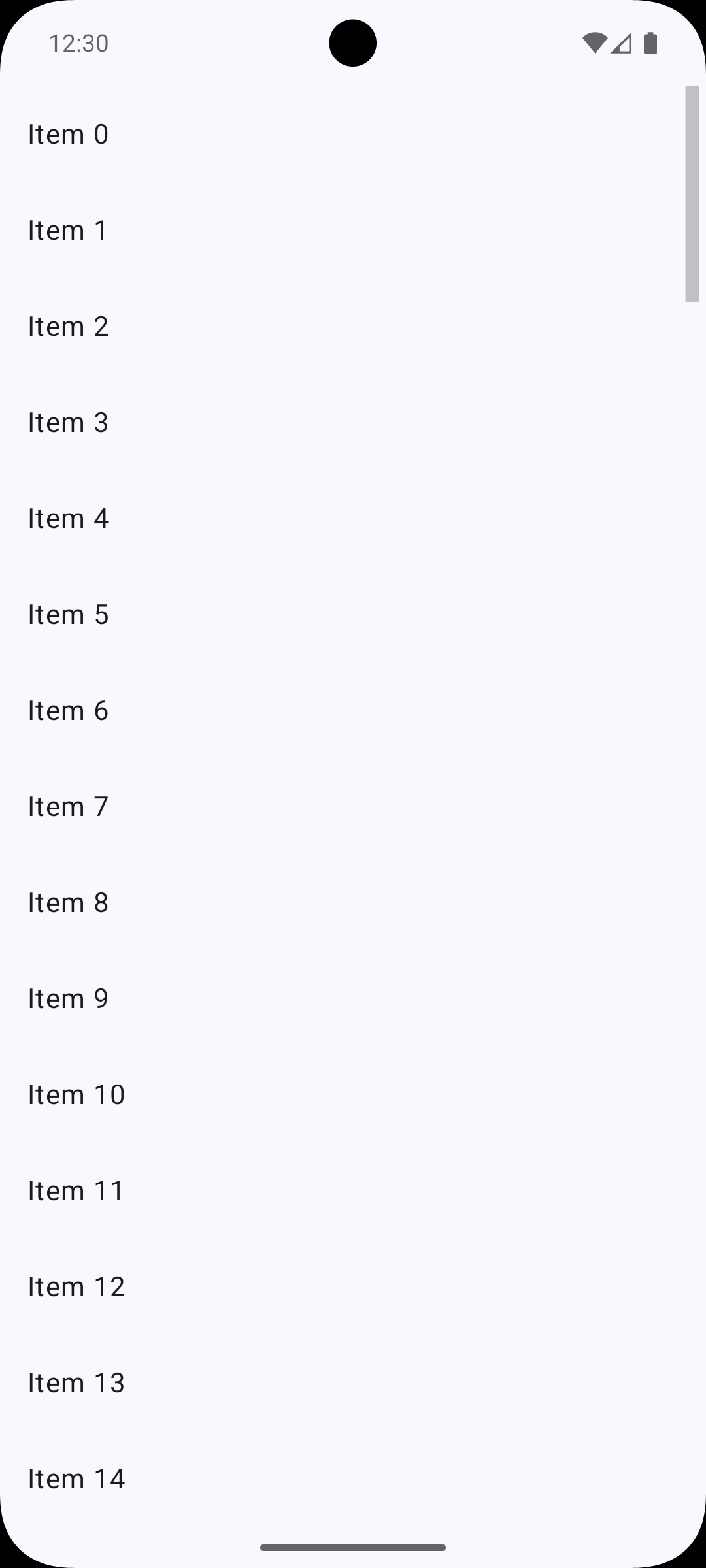 The default scroll indicator is functional but basic. If you want something that matches Material 3’s scrollbar design (like what you’d see in Views), you’ll need to create a custom ScrollIndicatorFactory. Here’s an implementation that approximates the Material 3 scrollbar, matching the constants from Android’s ViewConfiguration: